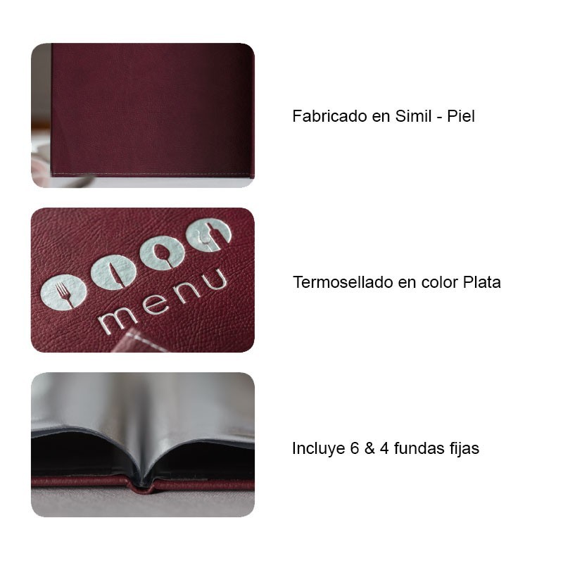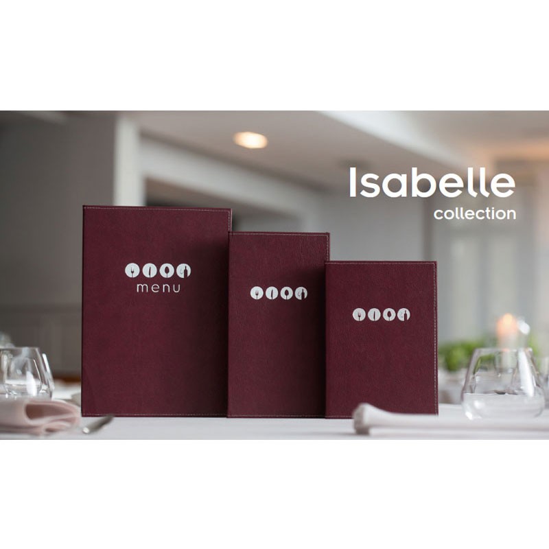 Portamenús coleção Isabelle é fabricado em imitação de pele com termosellado na cor prata e coberturas fixas de PVC. Ideal para hotelaria e restauração. Tamanho a escolher.