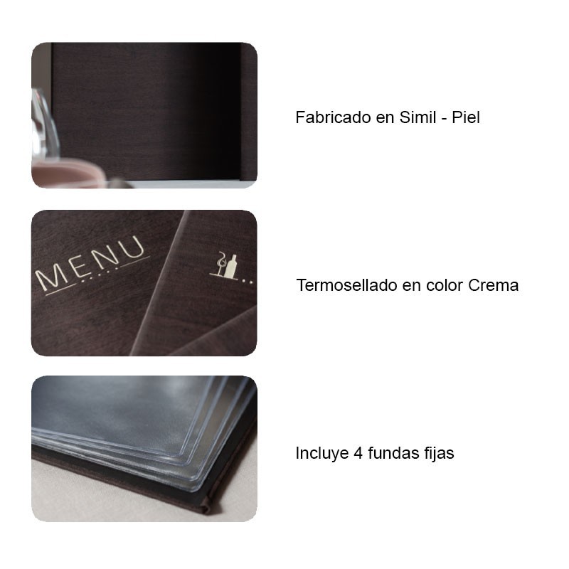 Portamenús coleção René é fabricado em imitação de pele com termosellado em cor creme e coberturas fixas de PVC. Ideal para hotelaria e restauração. Tamanho a escolher.