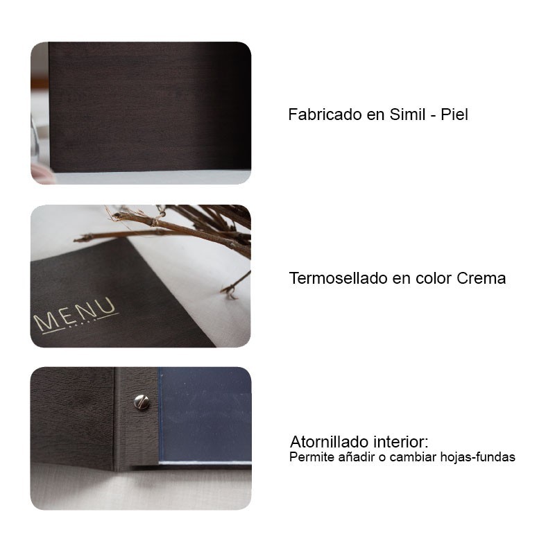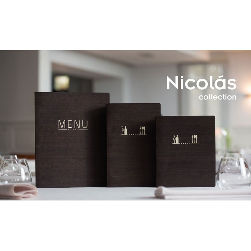 Portamenús coleção Nicolau é fabricado em imitação de pele flexível com termosellado em cor creme e luvas de PVC com rosca interior. Ideal para hotelaria e restauração. Tamanho a escolher.