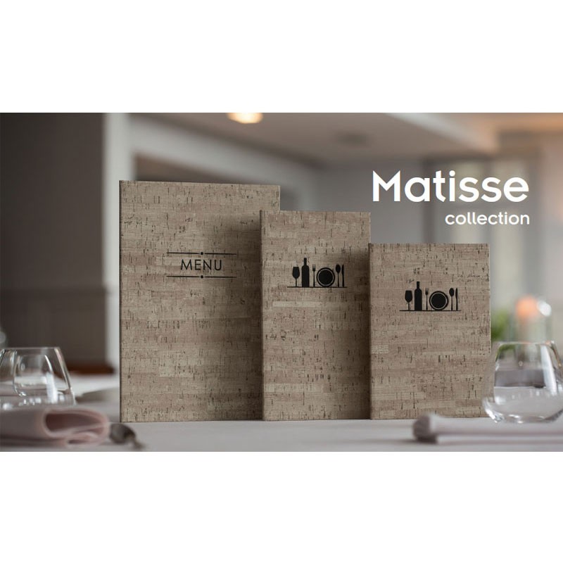 Portamenús coleção Matisse é fabricado em imitação de pele com termosellado na cor preta e luvas fixas de PVC. Ideal para hotelaria e restauração. Tamanho a escolher.
