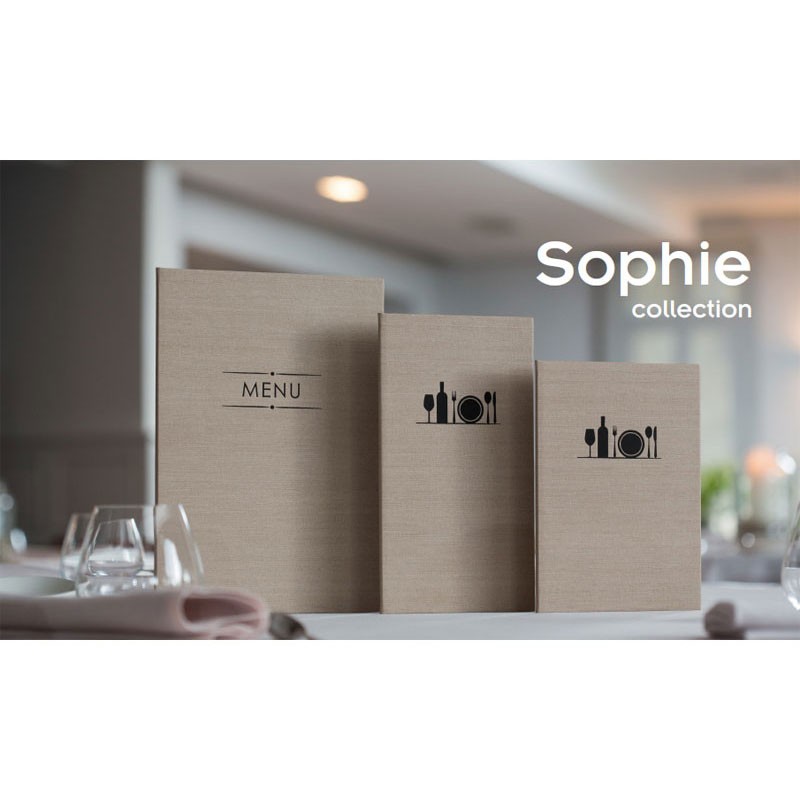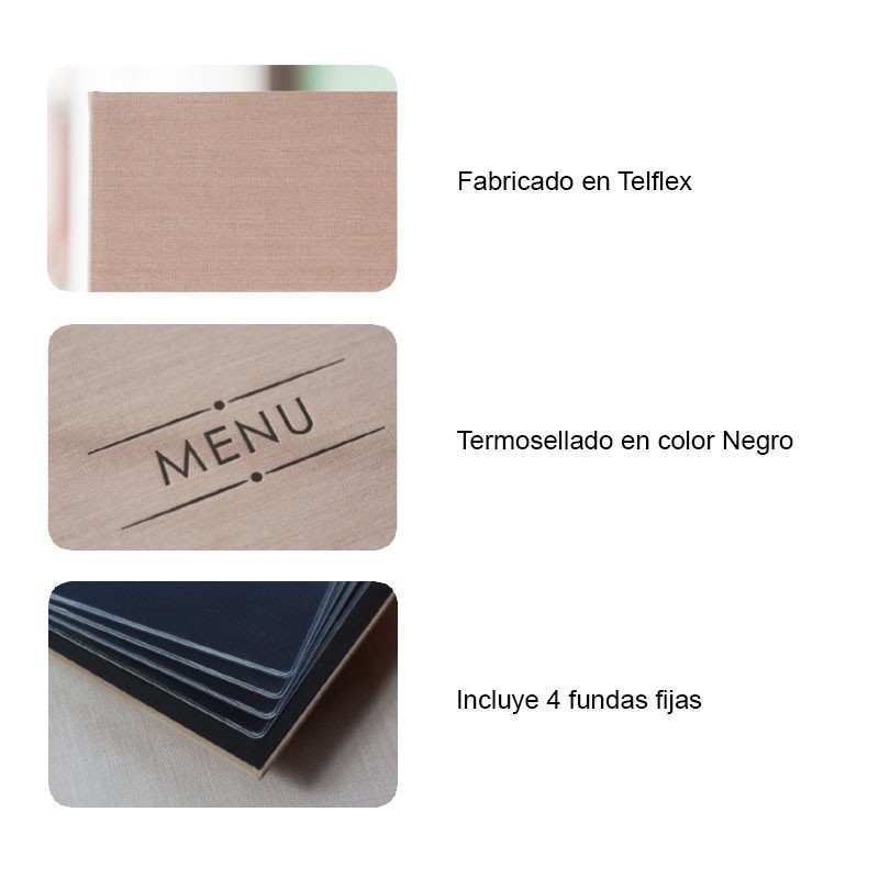 Portamenús coleção Sophie fabricados em Telflex com termosellado na cor preta e luvas fixas de PVC. Ideal para hotelaria e restauração. Tamanho a escolher.