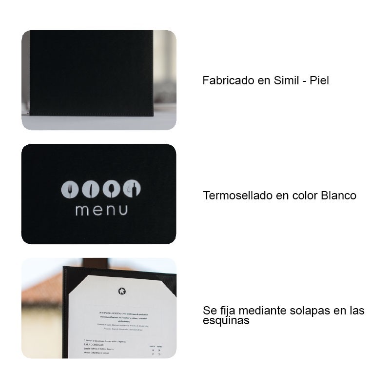 Portamenús coleção Marie é fabricado em imitação de pele flexível com termosellado na cor branco e abas fixas para a tampa. Ideal para hotelaria e restauração. Tamanho A4: 23x32 cm