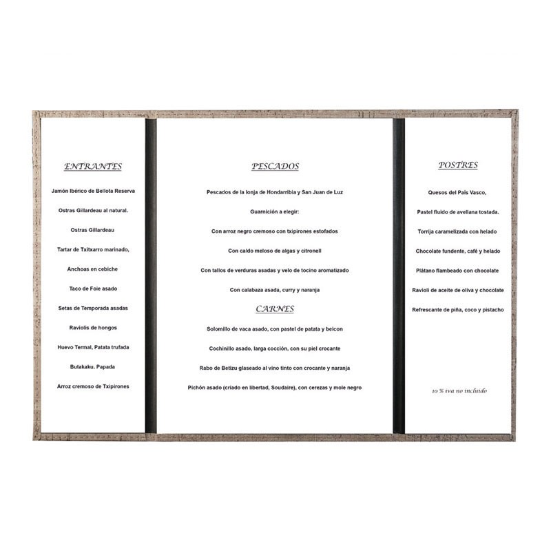 Portamenús coleção Goya é fabricado em imitação de pele com termosellado em cor preta e que tem 3 abas transparentes. Ideal para hotelaria e restauração. Tamanho A4: 23x32 cm