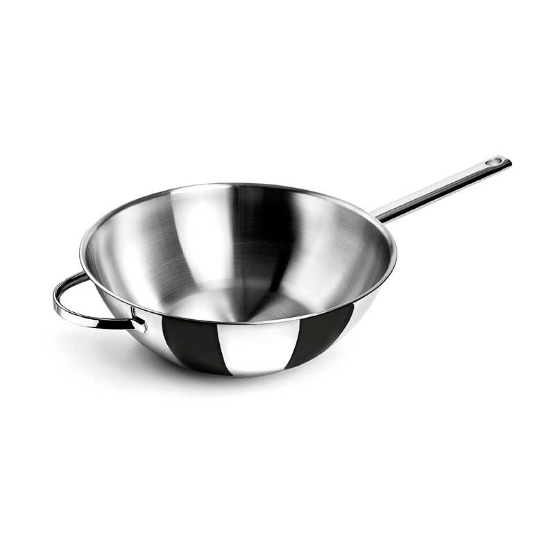 Wok modelo Belly fabricado em aço inoxidável 18/10 com fundo termodifusor sanduíche adequado para placas de indução, elétricos, placas e fogões a gás.