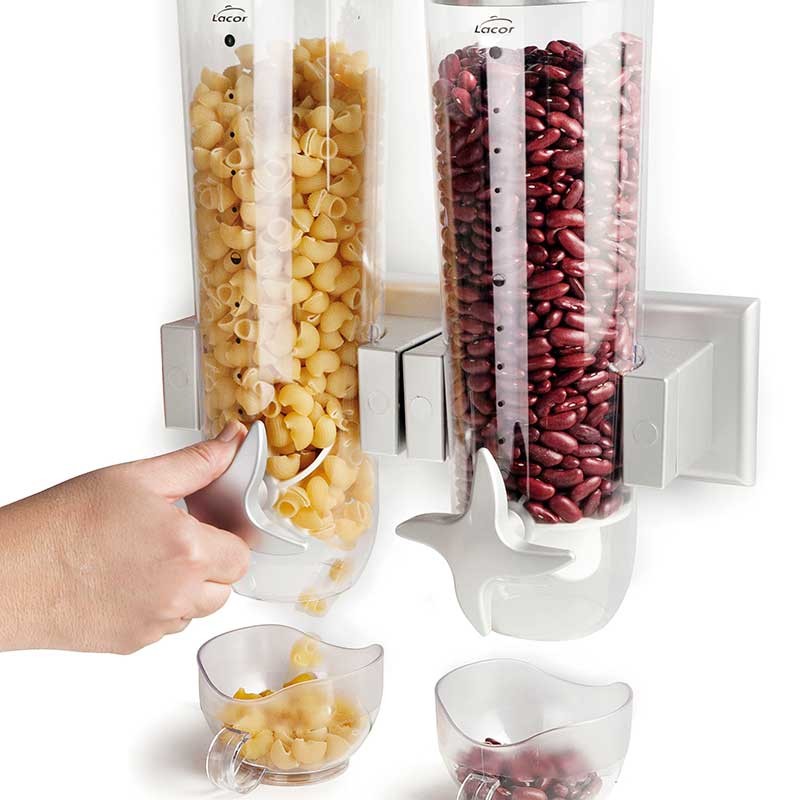 Dispensador duplo de cereais para parede com sistema dispensador giratório fácil de utilizar. Ideal para alimentos como cereais, flocos de aveia, pasta, café, frutos secos, etc.