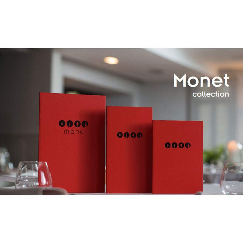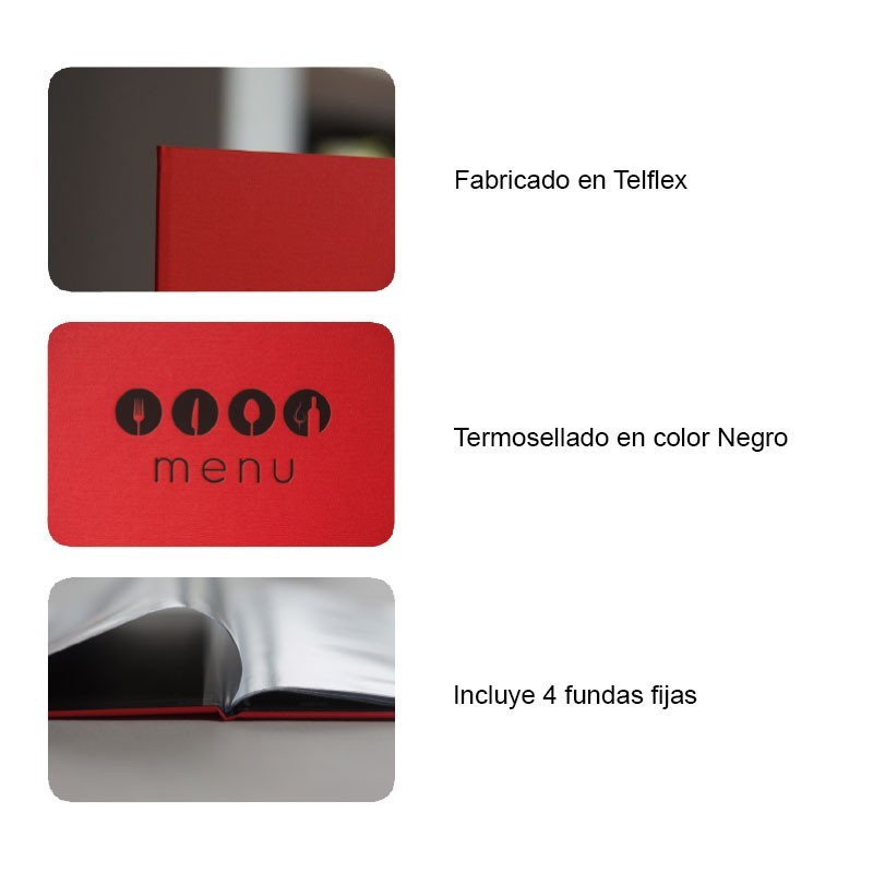 Portamenús coleção Monet fabricados em Telflex com termosellado na cor preta e luvas fixas de PVC. Ideal para hotelaria e restauração. Tamanho a escolher.