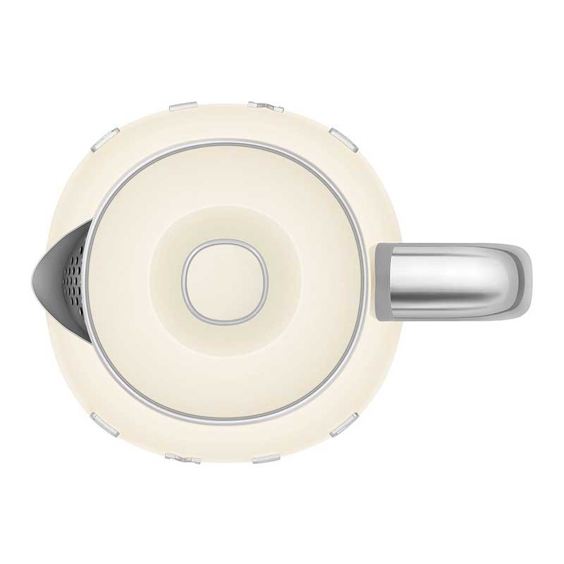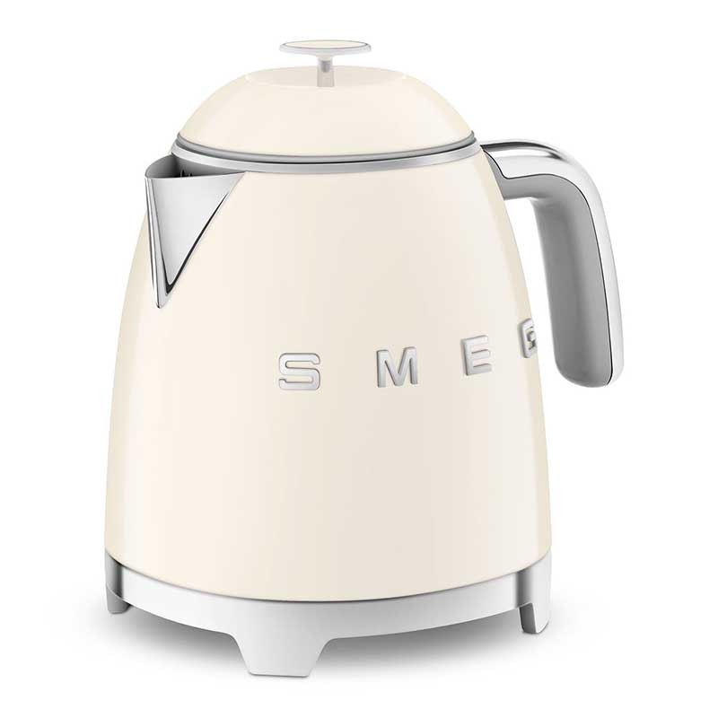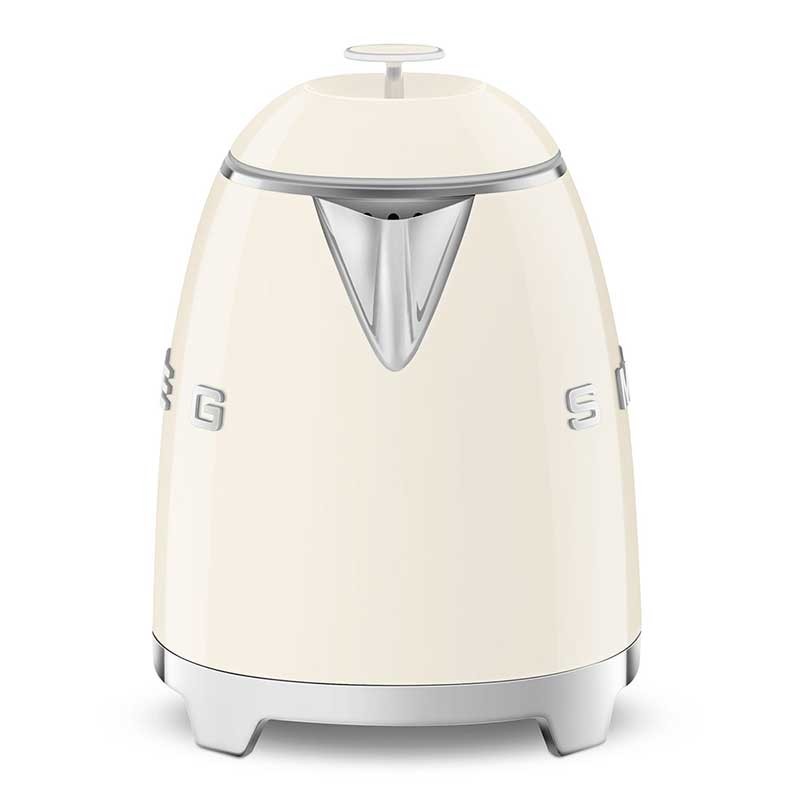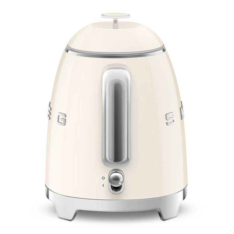 Chaleira mini Smeg 50's Style de 0,8 litros de capacidade com corpo em plástico acabamento creme brilho e base giratória 360º.