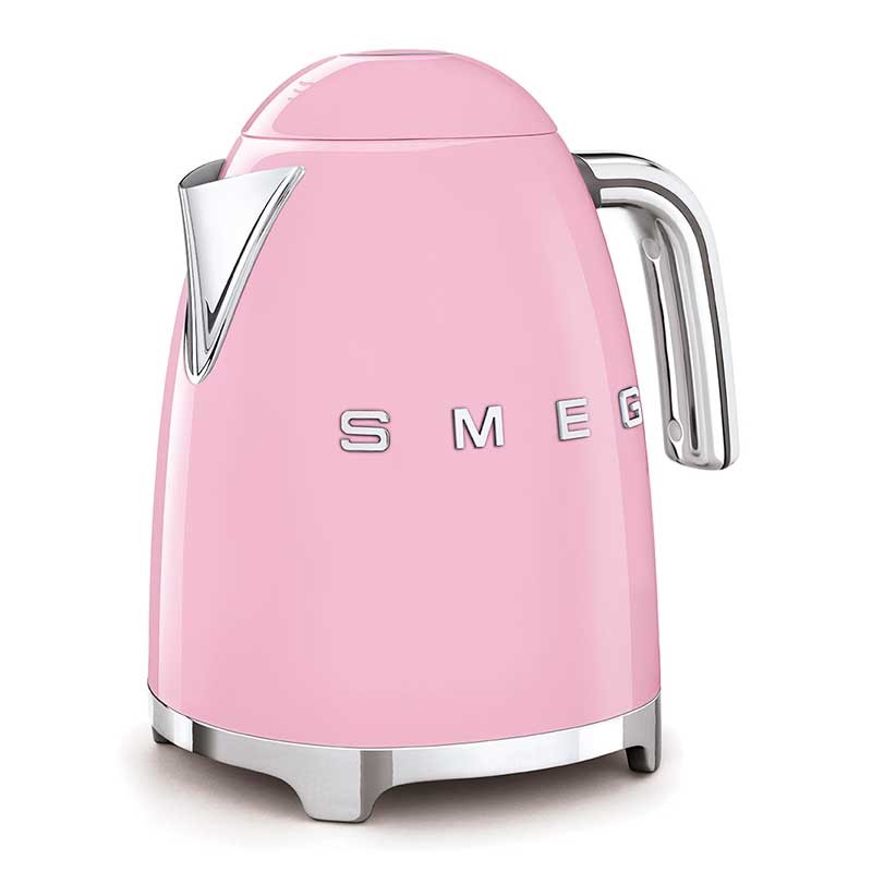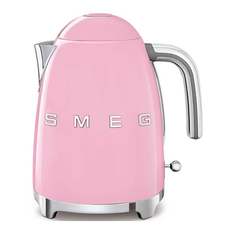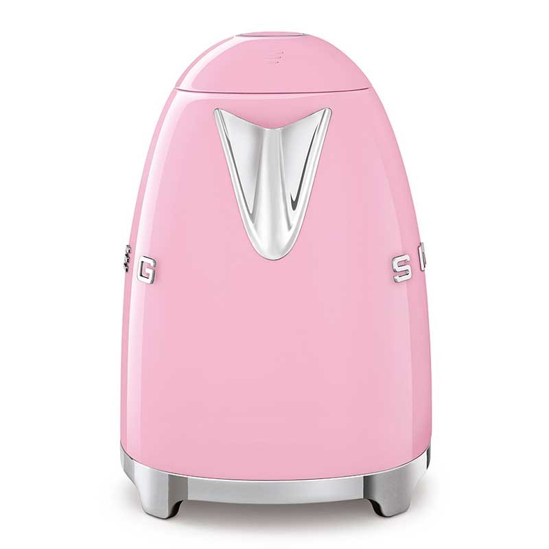 Chaleira padrão Smeg 50's Style de 1,7 litros de capacidade com corpo em aço inoxidável acabamento rosa brilho e base giratória 360º.
