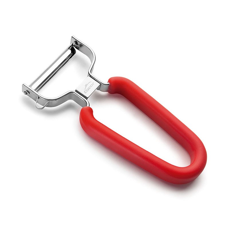 Expanda Descascador de batatas em "E" de 12,5 cm de comprimento, fabricado em aço inoxidável de alta qualidade com punho em termoplástico vermelho.