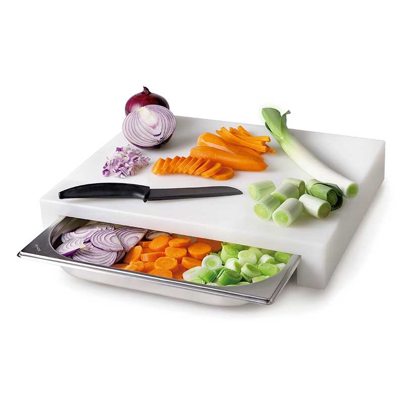 Prática tábua de corte com uma recipiente Gastronorm GN 2/3 de aço inoxidável e oculta completamente removível para recolher os alimentos cortados.Fabricada em polietileno de alta densidade de cor branca.