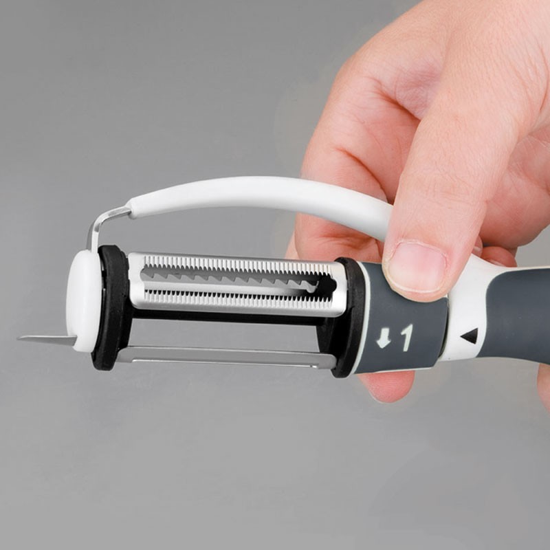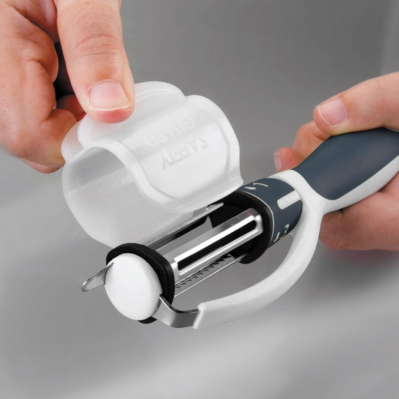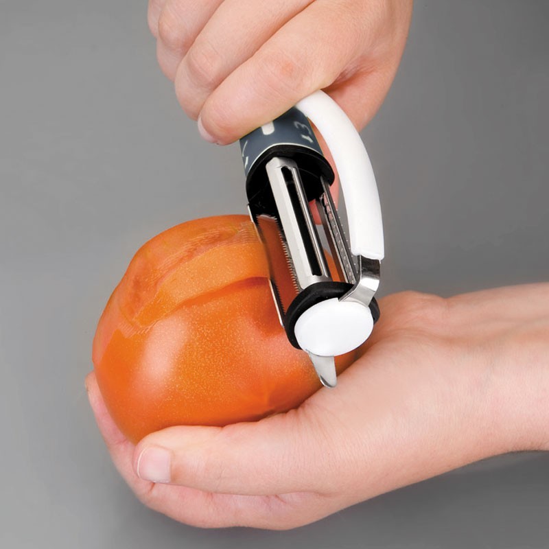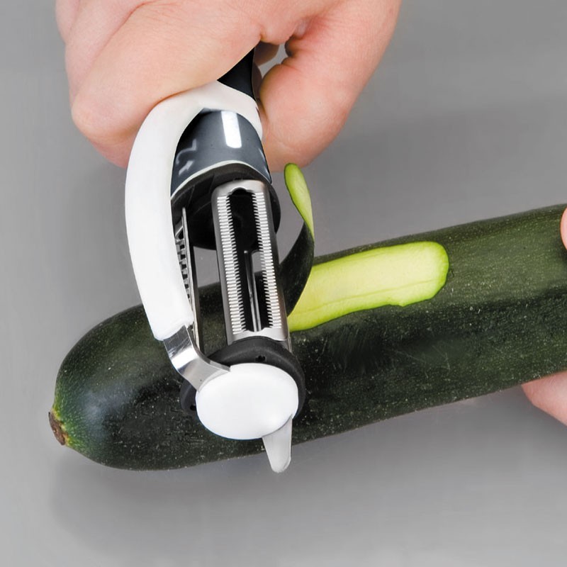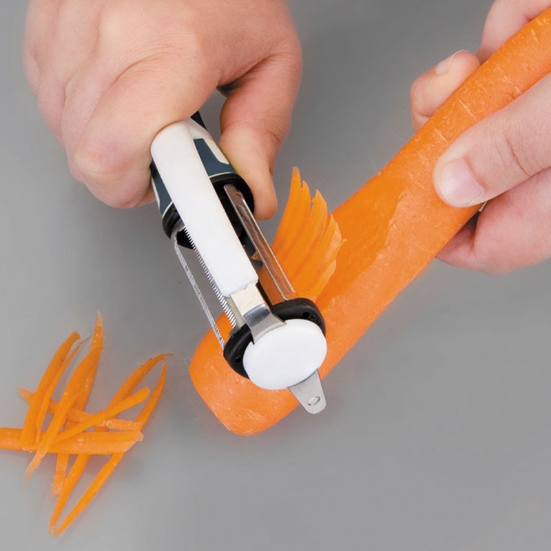Descascador tipo "P" de 20 cm de comprimento, com 3 lâminas rotativas de aço inoxidável 18/10 de alta qualidade e resistência à corrosão.