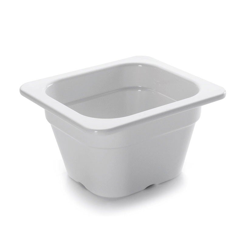 Balde tamanho GN 1/6 de 176x162 mm para cozinhas profissionais fabricada em resina sintética branca de alta qualidade e resistência.