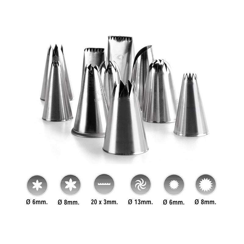 Expanda Conjunto de 6 bicos de confeitaria para saco de confeitar com 4 formas variadas e fabricadas em aço inoxidável 18/10 de alta qualidade e resistência à corrosão.