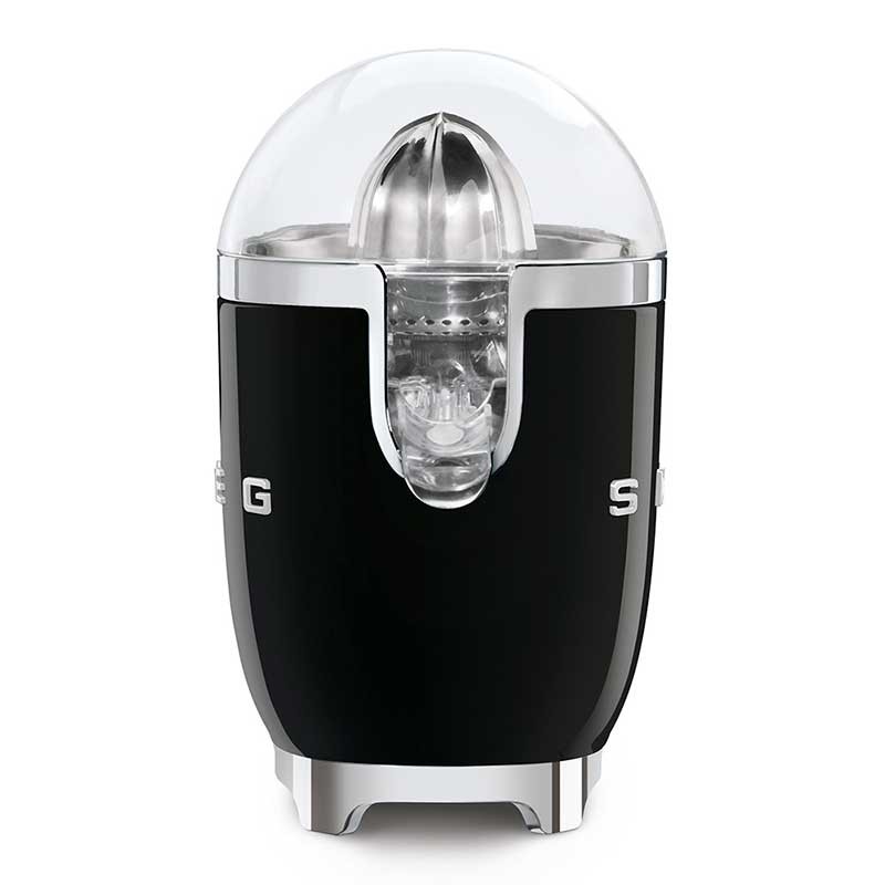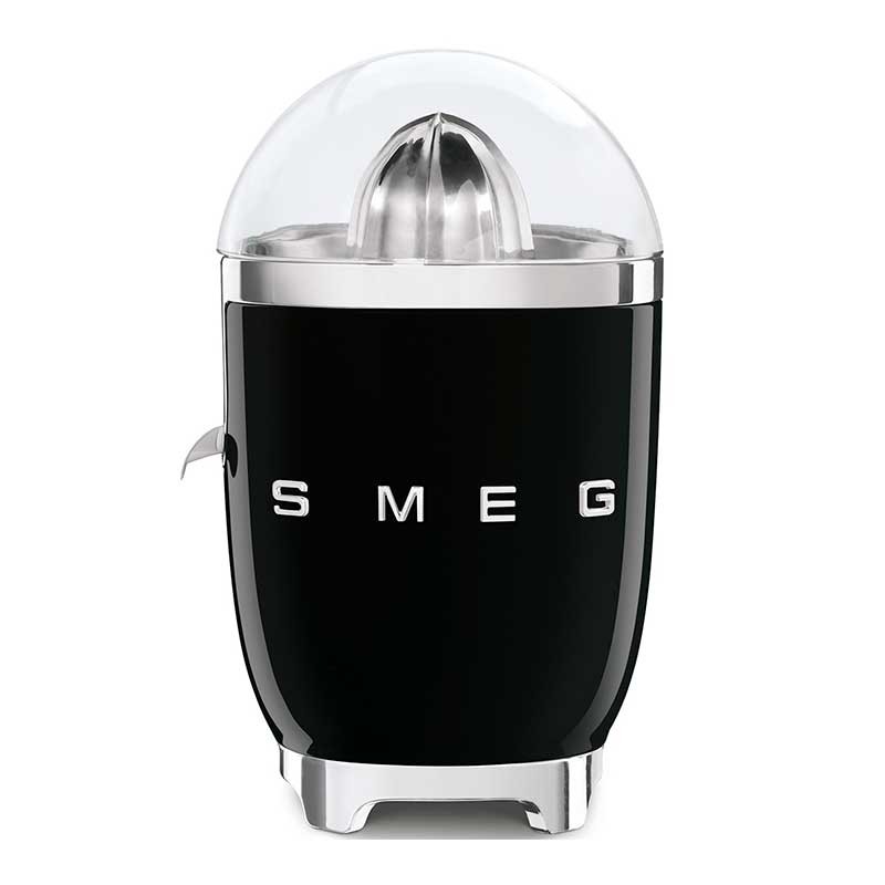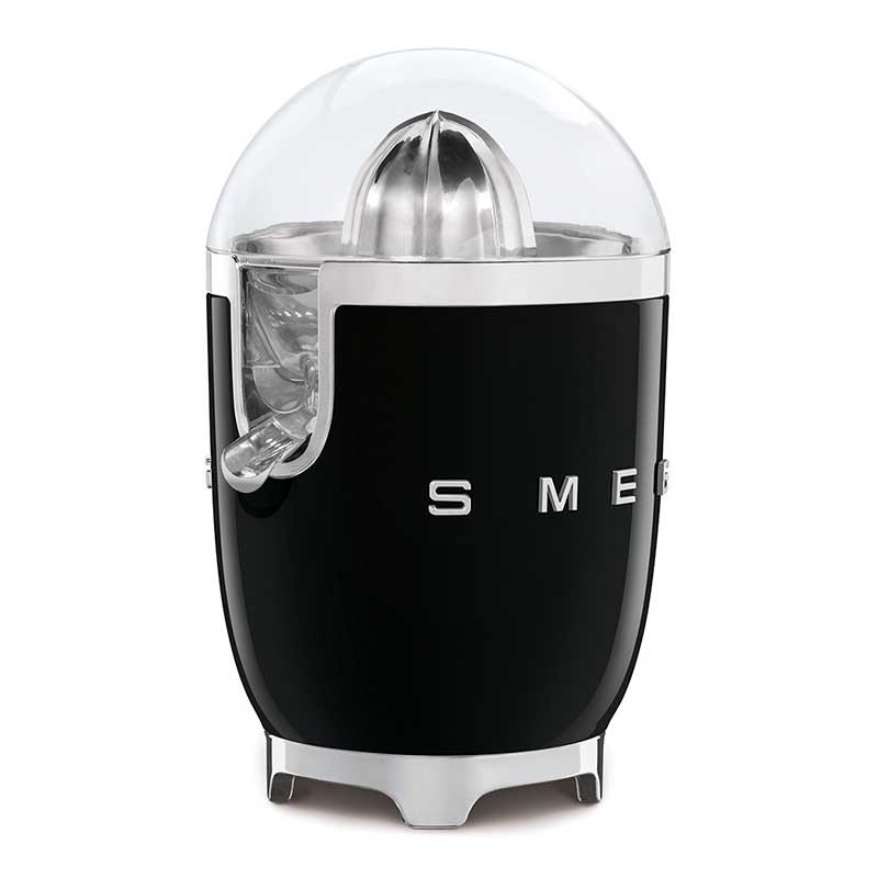 Espremedor de suco manual Smeg 50's Style de 70W com corpo de alumínio fundido acabamento preto brilho e cone de aço inoxidável.