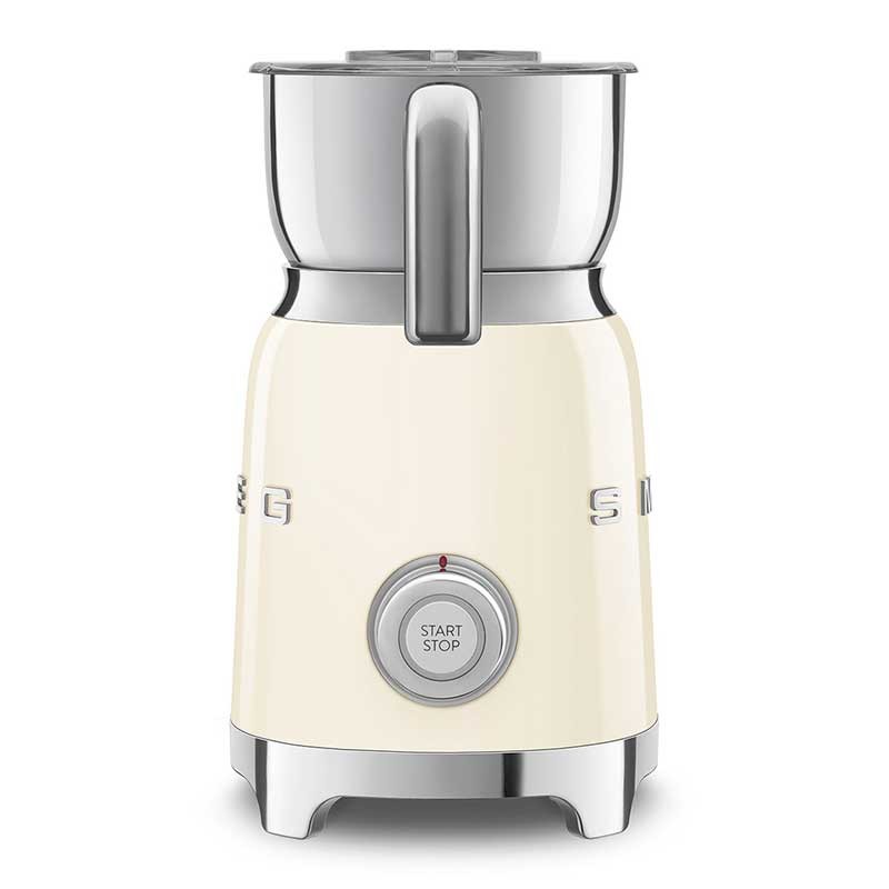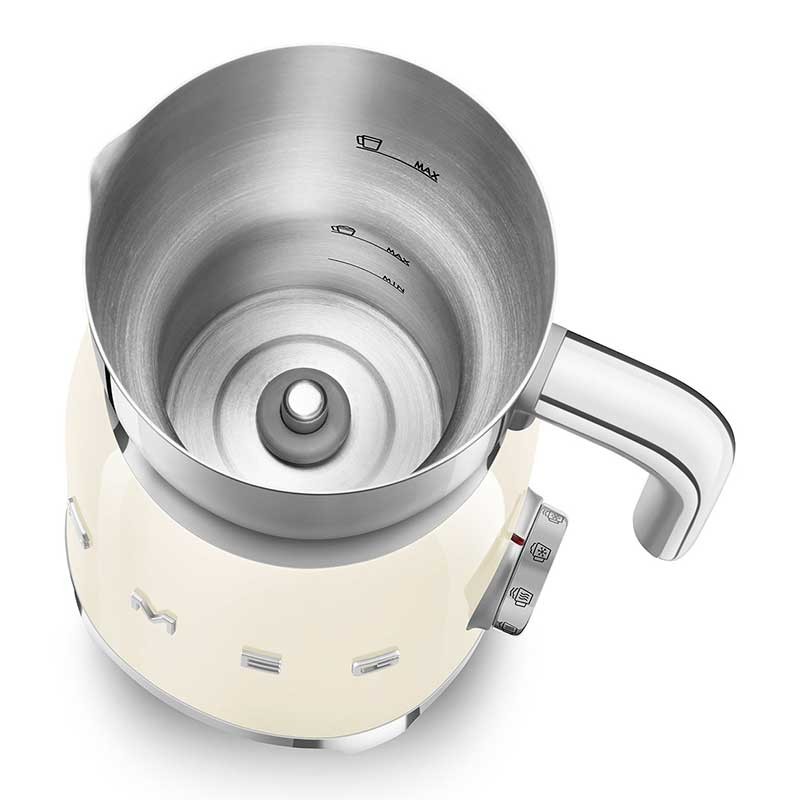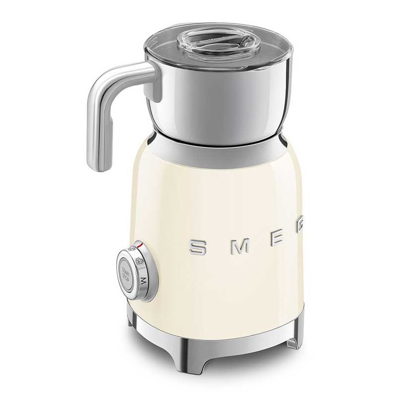 Espuma de leite Smeg 50's Style com corpo em aço inoxidável acabamento creme brilho e 6 programas para preparar bebidas quentes ou frias com ou sem espuma.