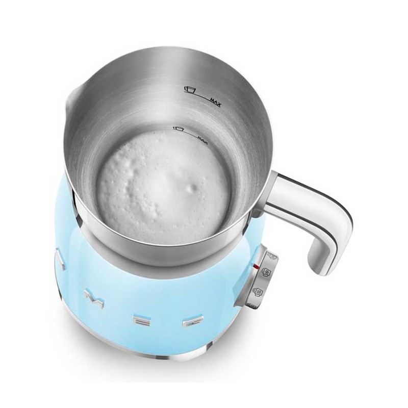 Espuma de leite Smeg 50's Style com corpo em aço inoxidável acabamento azul céu brilho e 6 programas para preparar bebidas quentes ou frias com ou sem espuma.