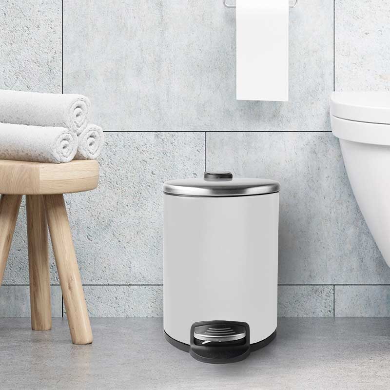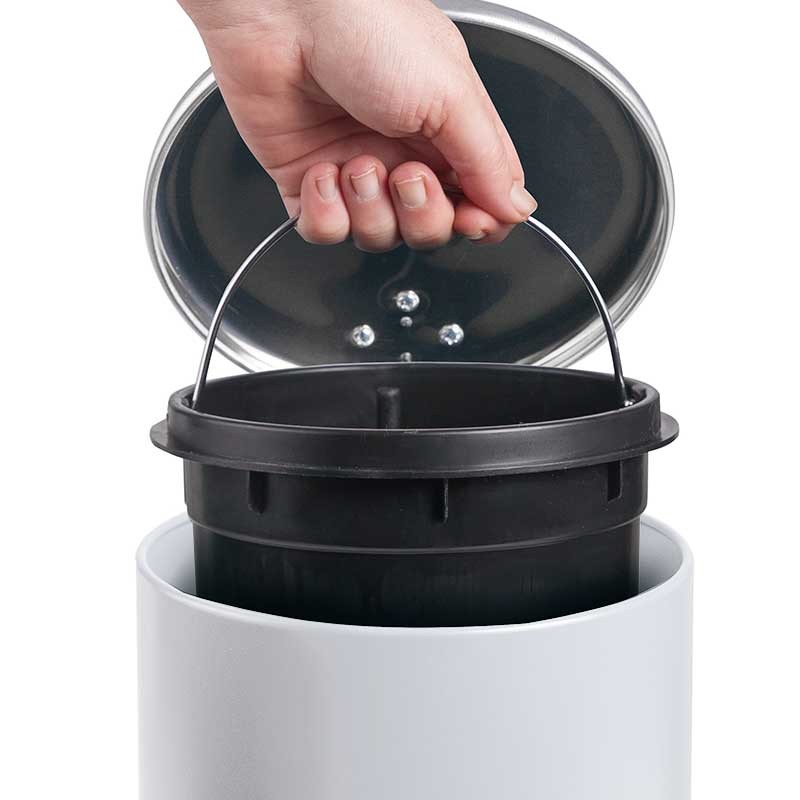 Papeleira de 3 litros em aço inoxidável cor branco com pedal de abertura da tampa e cuvete interior extraível de polipropileno com asa.