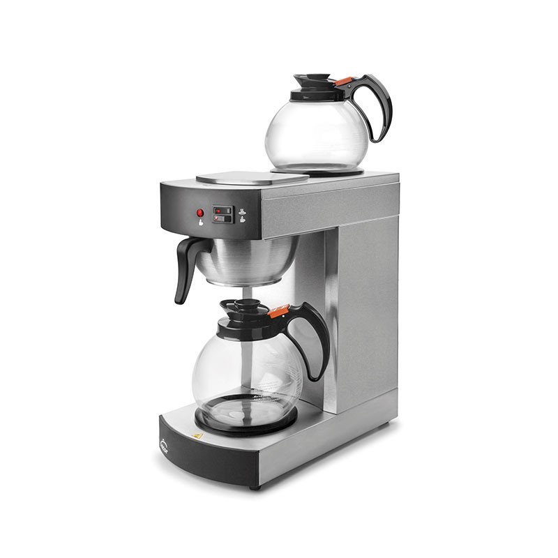 Cafeteira elétrica de gotejamento automática de 2100 W, fabricada em aço inoxidável 18/10 com 2 jarras de vidro de 1,8 litros de capacidade.