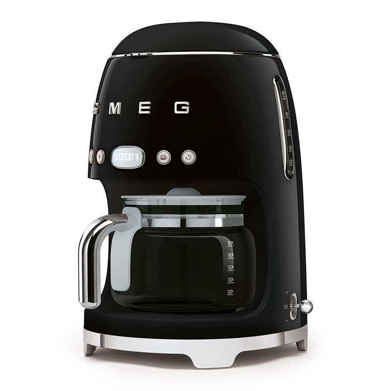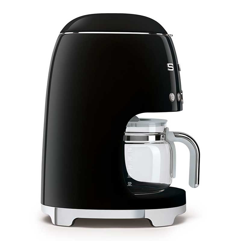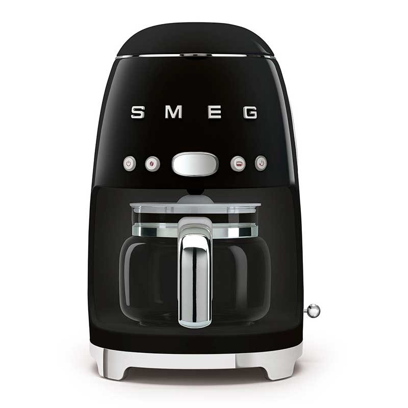 Cafeteira de gotejamento-filtro Smeg 50's Style com seleção de intensidade de café regulável e corpo de aço inoxidável e ABS acabamento preto brilho.