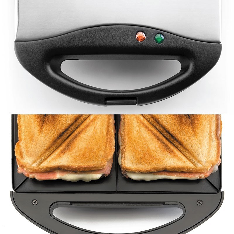 Tostadeira elétrica para fatias triangulares de 750 W, com revestimento anti-aderente, termostato automático e alça de toque frio.