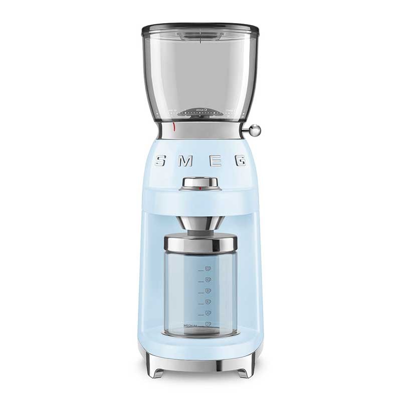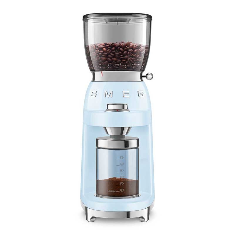 Smeg 50's estilo moedor de café elétrico com 30 diferentes níveis de moagem de grãos e corpo de aço inoxidável acabamento céu azul brilho.