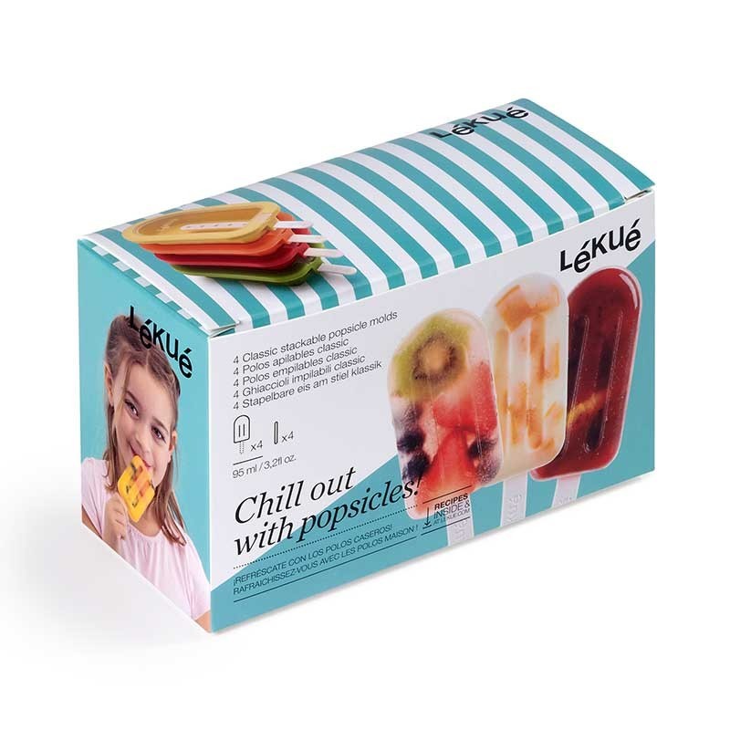 Pack de 4 moldes empilháveis de silicone flexível e reutilizável para preparar facilmente os seus próprios pólos caseiros em porções individuais.