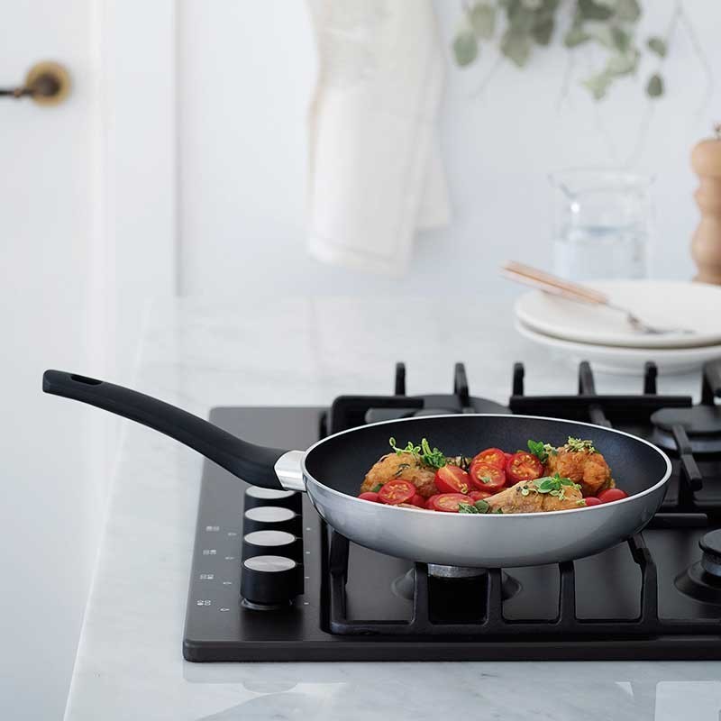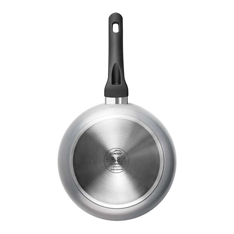 Frigideira gama de Vide Lacor fabricada em alumínio com revestimento antiaderente reforçado anti-riscos e plano de fundo full induction.