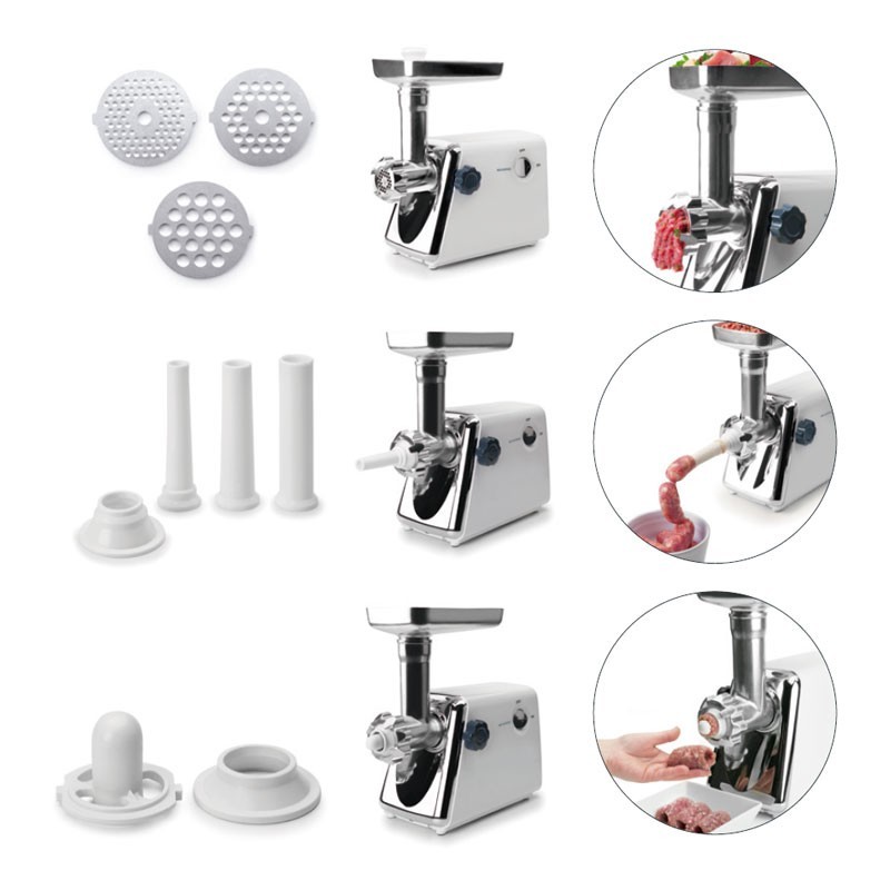Moedor elétrico da carne modelo Chop semi-profissional de 300 W com 3 discos intercambiáveis de aço inoxidável para fatiar em diferentes tamanhos.