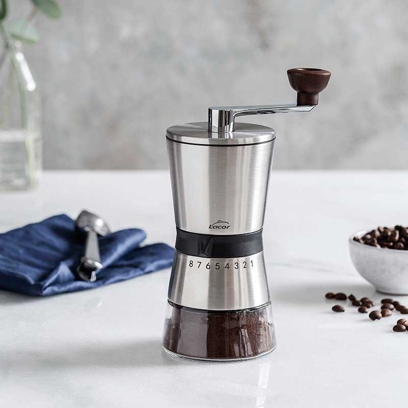 Moinho manual com rodas de cerâmicas, 8 níveis de moído, corpo de aço inoxidável 18/10 de alta qualidade e depósito de vidro.