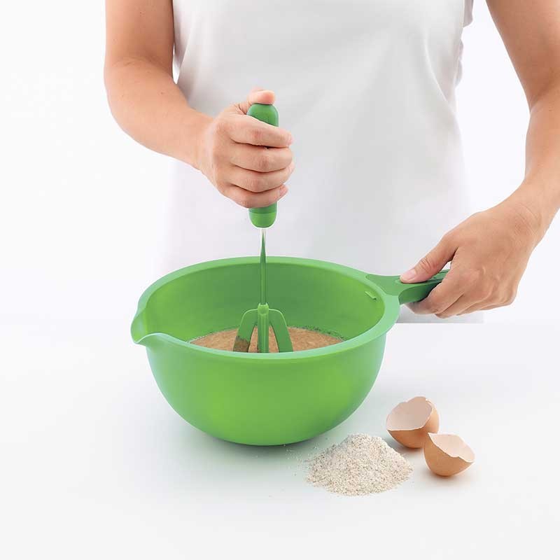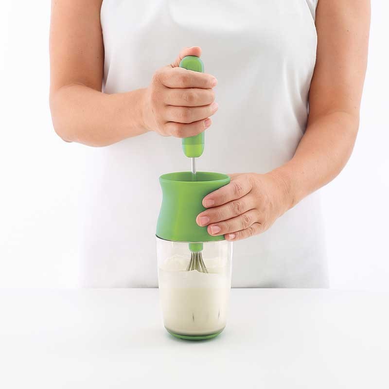 O batedor funciona com um sistema de pressão e rotação: basta pressionar para baixo o suporte e a cabeça gira para obter o resultado desejado.