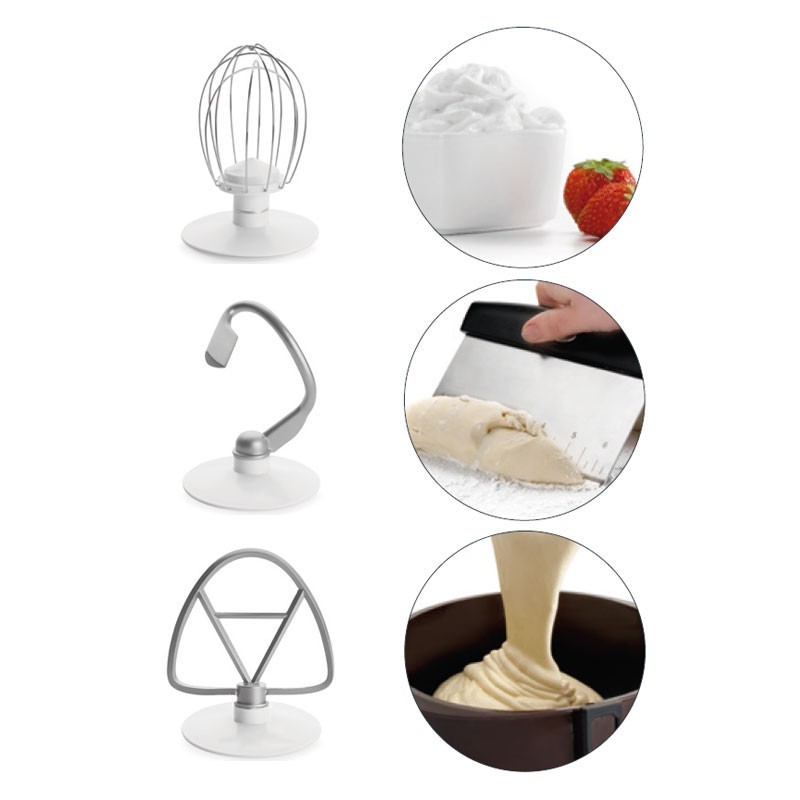 Liquidificador amassadeira modelo Gourmet com uma tigela de aço inoxidável, 3 cabeçotes de mistura intercambiáveis, 600 w de potência e 6 velocidades.