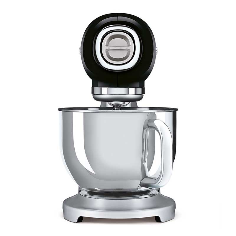 Smeg 50's Style batedeira com corpo em alumínio fundido, tampa superior em acabamento preto brilho, 800 W de potência e 10 velocidades.
