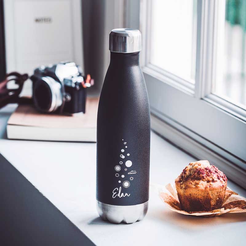 Garrafa de aço inoxidável com tampa hermética modelo Edan Black para transportar e manter bebidas quentes ou geladas.