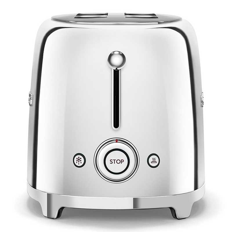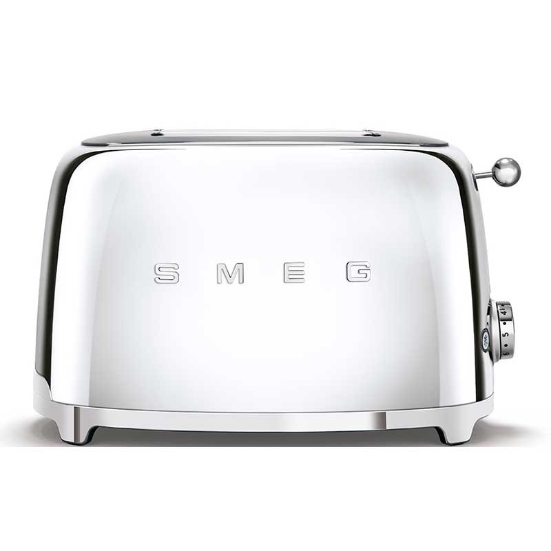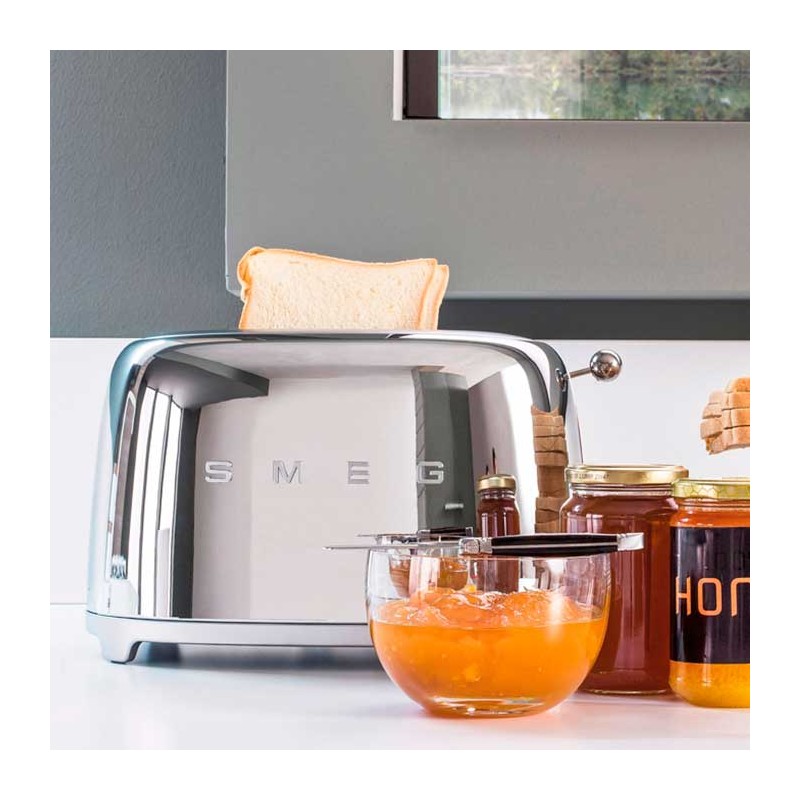 Torradeira Smeg 50's Style com corpo em aço inoxidável acabamento cromado brilho com 6 níveis de aquecimento e 2 ranhuras para 2 torradas.