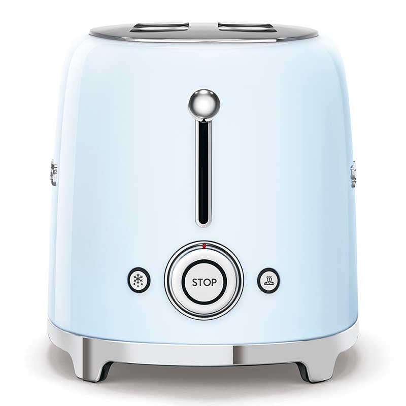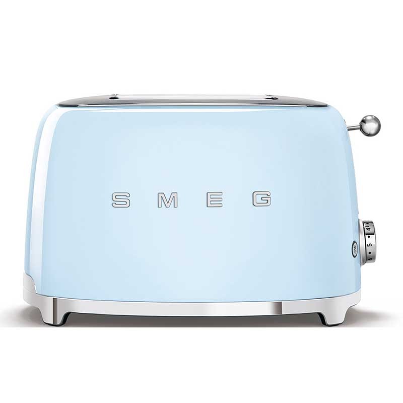 Torradeira Smeg 50's Style com corpo em aço inoxidável Cor Azul céu brilho com 6 níveis de aquecimento e 2 ranhuras para 2 torradas.