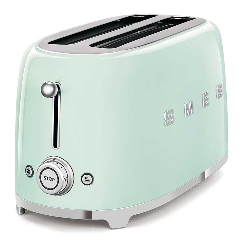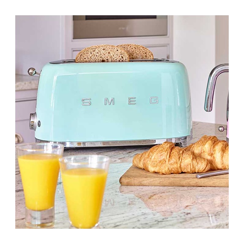 Torradeira Smeg 50's Style com corpo em aço inoxidável Cor Verde Água Brilho com 6 níveis de aquecimento e 2 ranhuras para 4 torradas.