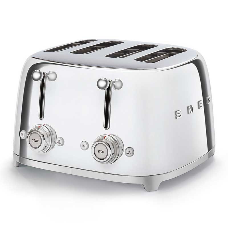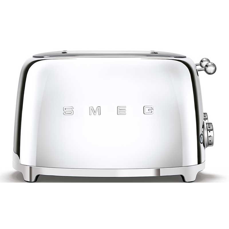 Torradeira Smeg 50's Style com corpo em aço inoxidável acabamento cromado brilho com 6 níveis de aquecimento e 4 ranhuras para 4 torradas.