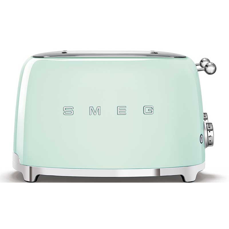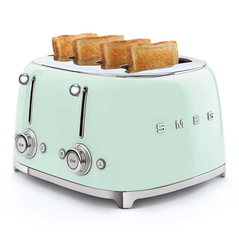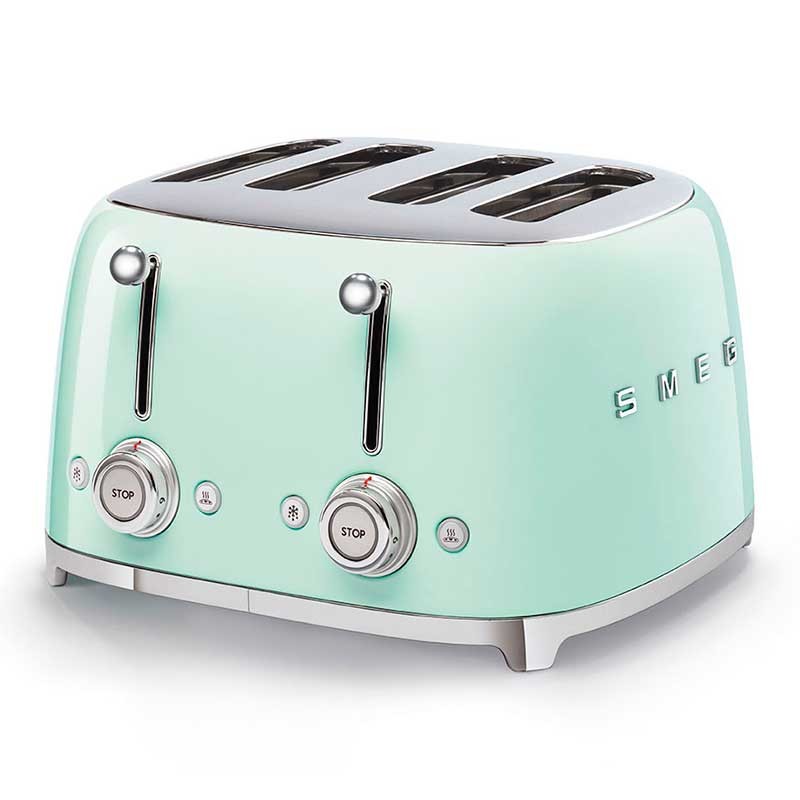 Torradeira Smeg 50's Style com corpo em aço inoxidável Cor Verde Água Brilho com 6 níveis de aquecimento e 4 ranhuras para 4 torradas.