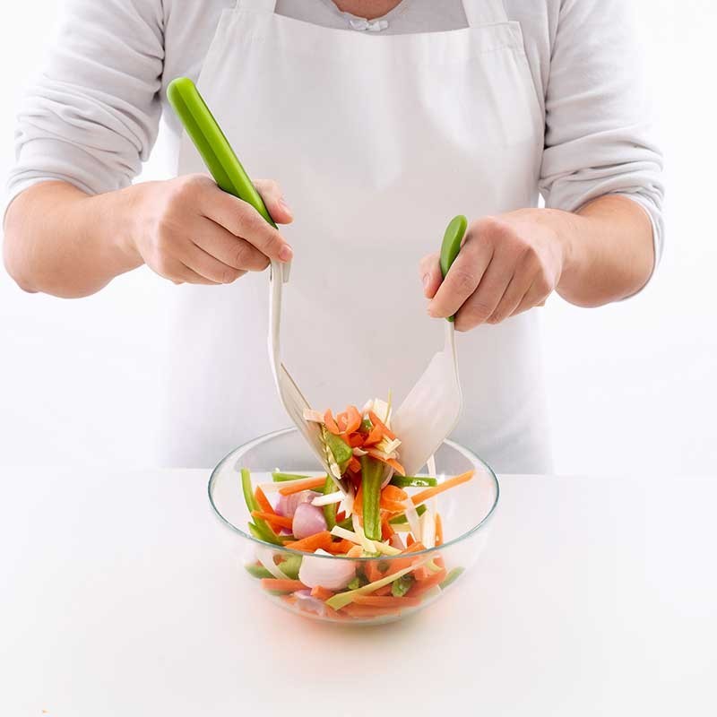 O utensílio mais versátil para a cozinha, já que contém 3 utilizações em 1. Espátula grande para recolher ou virar comida na frigideira, pinças de grande tamanho para virar carnes ou peixes e pás para misturar saladas, legumes, etc. Drena o líquido que sobrar graças aos buracos na pá grande. Mais limpo, ensuciarás menos utensílios e removível para melhor limpeza.