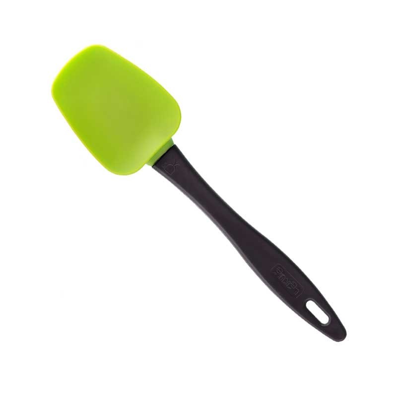 Colher de cozinha de 27 cm de comprimento, fabricada com cabeça de silicone vermelho ou verde para escolher e pega ergonómica de nylon preto.