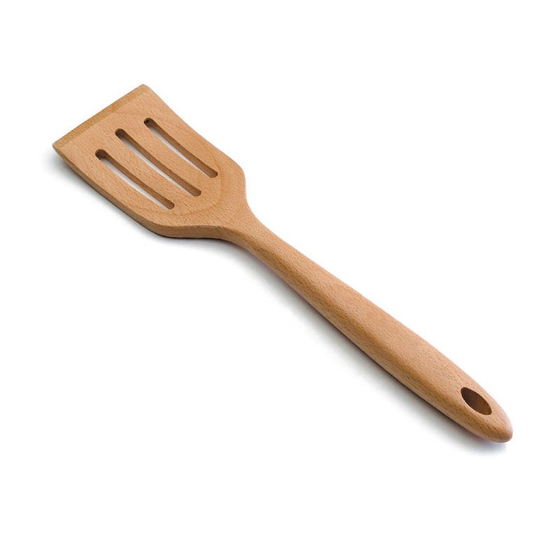Espátula perfurada para cozinha da Série Brun de 30 cm de comprimento, em madeira de faia natural de alta qualidade apta para panelas não-aderentes.