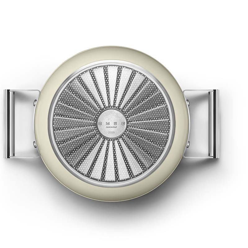 Caçarola antiaderente com tampa Smeg 50's Style de 24 cm de diâmetro, corpo em alumínio forjado e acabamento exterior bege creme mate.