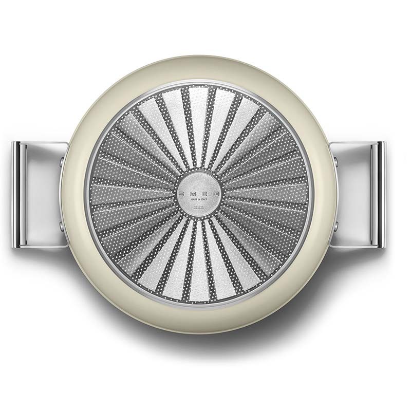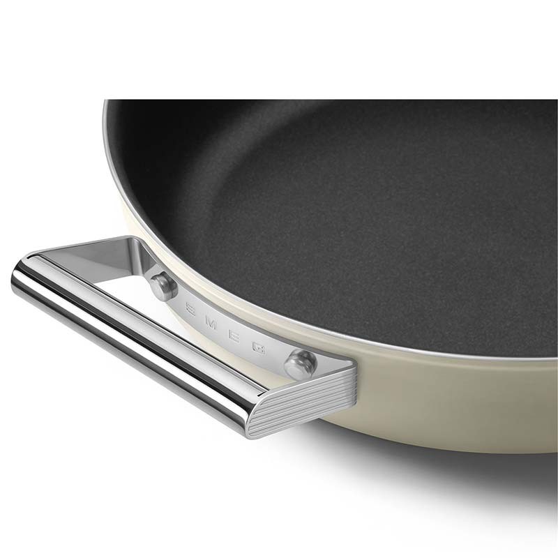 Panela baixa antiaderente com tampa Smeg 50's Style de 28 cm de diâmetro, corpo em alumínio forjado e acabamento exterior bege creme fosco.