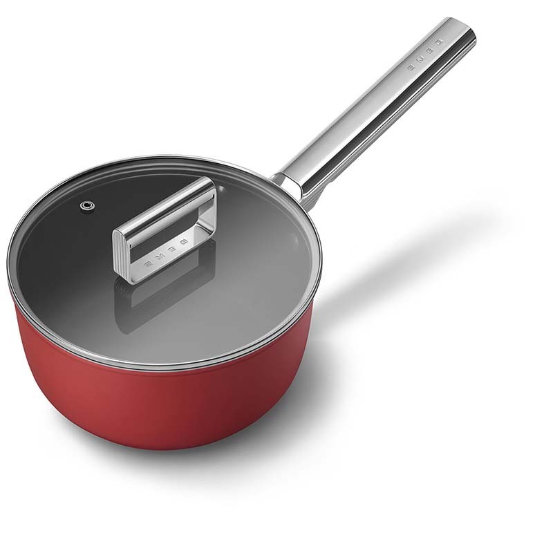 Panela antiaderente com tampa Smeg 50's Style com 20 cm de diâmetro, corpo em alumínio forjado e acabamento exterior vermelho mate.
