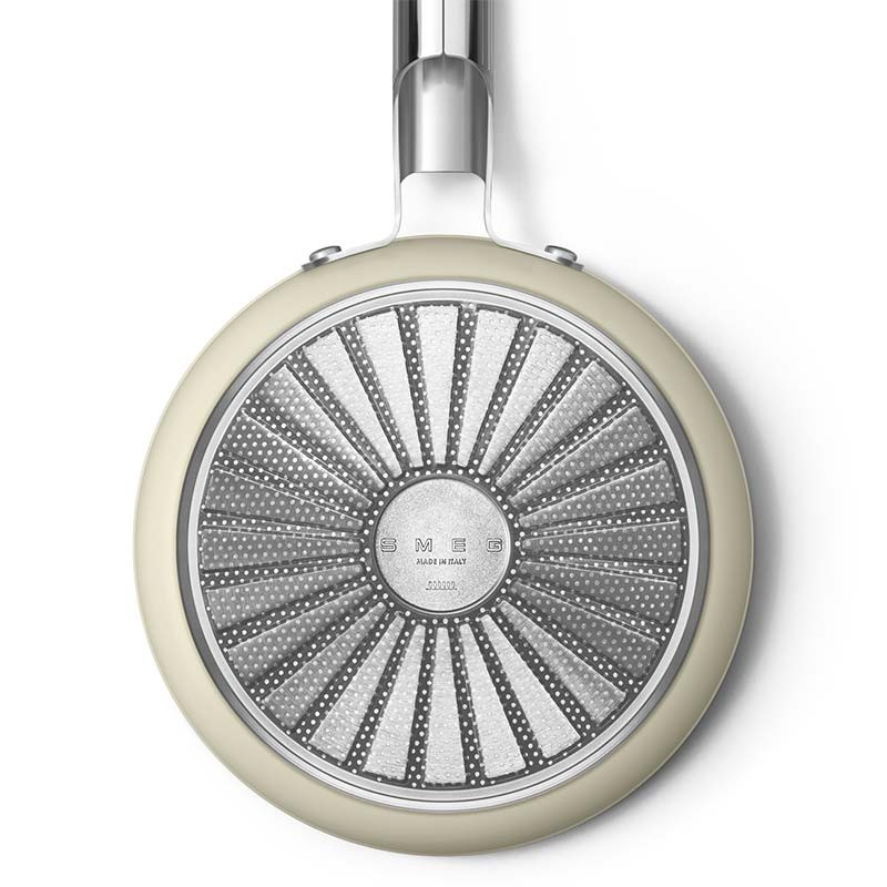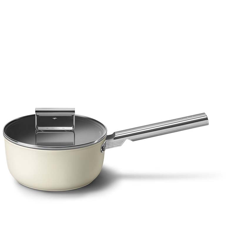 Panela antiaderente com tampa Smeg 50's Style com 20 cm de diâmetro, corpo em alumínio forjado e acabamento exterior bege creme mate.
