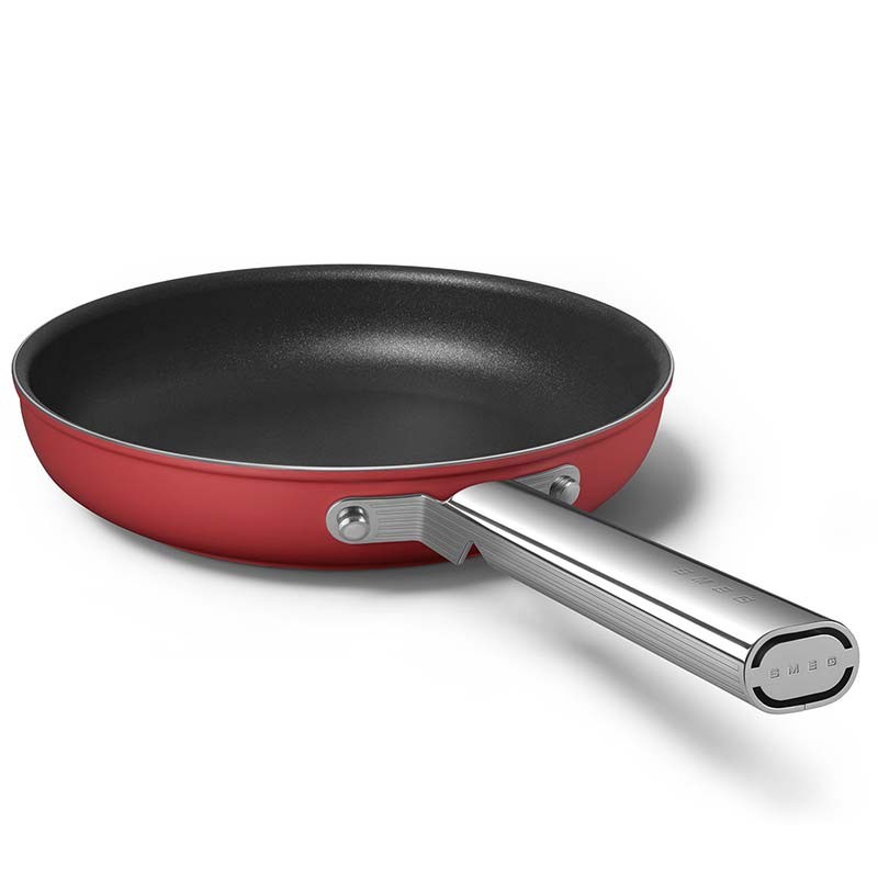 Frigideira antiaderente Smeg 50's Style com 24 cm de diâmetro, corpo em alumínio forjado e acabamento exterior vermelho mate.