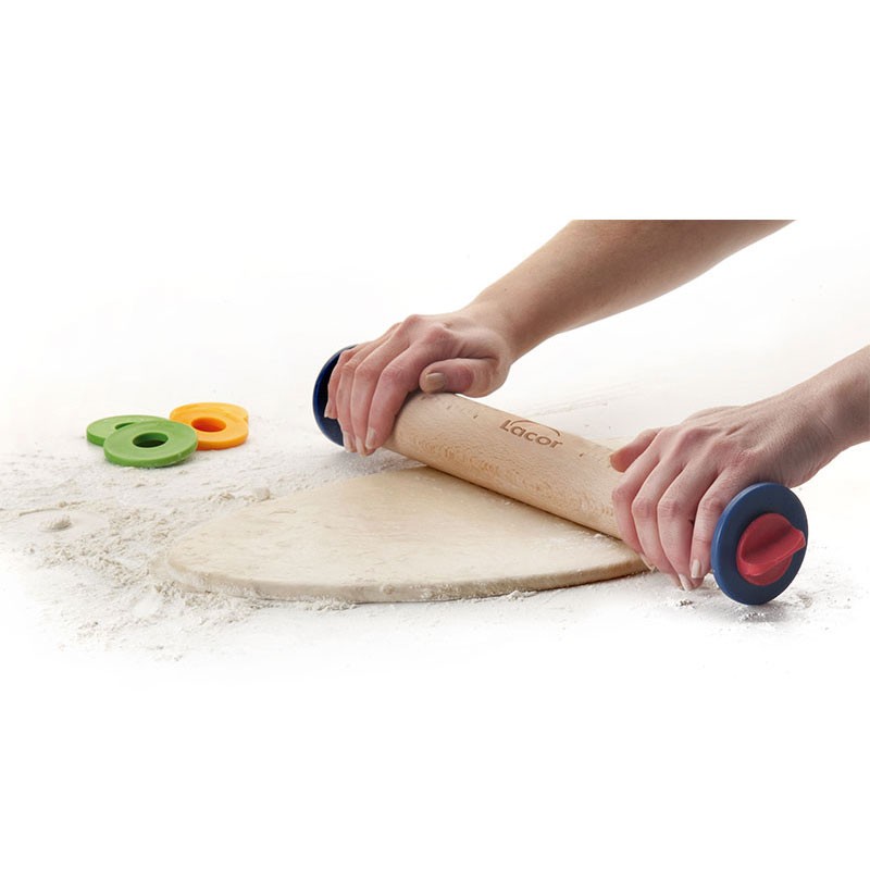 Rolo de cozinha de 38 cm em madeira de faia natural com anilhas para regular a espessura na elaboração de massas frescas ou pastelaria.