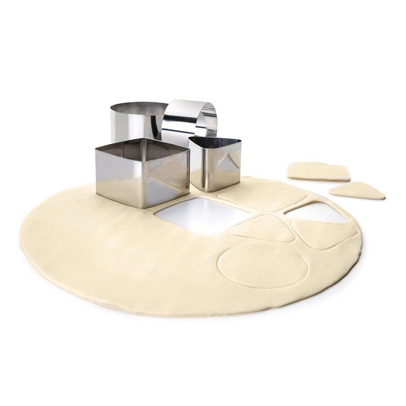 Set de 4 anéis com formas variadas, 2 redondos, 1 quadrado e 1 triangular. Ideal para trabalhos de pastelaria e corte da massa.