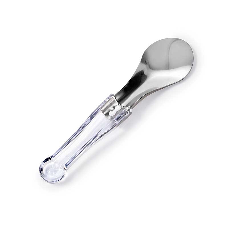 Colher para servir gelado fabricada em aço inoxidável com mango ergonómico na cor transparente e comprimento de 26,5 cm.